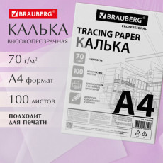 Калька А4 ВЫСОКОЙ ПРОЗРАЧНОСТИ, ПЛОТНАЯ, для печати и творчества, 70 г/м2, 100 листов, BRAUBERG, 116642