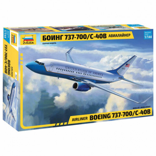 Сборная модель самолета авиалайнер пассажирский Боинг 737-700 С-40В - уменьшенный вариант современной американской авиационной техники. Соберите модель собственного авиалайнера и создайте свою коллекцию!Боинг 737-700 будучи представителем серии лайнеров «Next Generation» является типичным образцом узкофюзеляжного и двухдвигательного пассажирского самолёта. Самолёт был спроектирован в качестве замены предшествующей версии Боинга 737-300. Имеет современные технические характеристики и предназначается для осуществления авиарейсов малой и средней протяжённости. Первый полёт опытный Бонг 737-700 совершил 9 февраля 1997 г. Самолёт оборудован каютой отдыха экипажа, сиденьями бизнес-класса с рабочими столиками и каютами-спальнями для пассажиров.