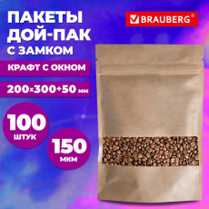 Пакет Дой-Пак с замком ZIP LOCK, крафт с окном 60 мм, 200 х 300 + 50 мм, 100 штук 150 мкм, BRAUBERG, 700694