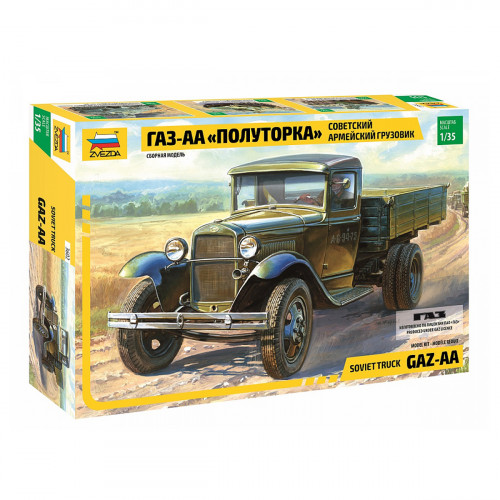 Сборная модель - Советский армейский грузовик "Полуторка" (ГАЗ-АА). Историческая справка: 29 января 1932 г. с конвейера сошел первый грузовик Газ-АА - самый массовый грузовик военных лет. За свою грузоподъемность в 1,5 тонны грузовик называли «полуторкой». Автомобиль обладал фантастической выносливостью, ремонтопригодностью и высокой проходимостью, потребляя при этом дешевый низкооктановый бензин. Наряду с танком Т-34 и реактивным минометом «Катюша», легендарная «полуторка» стала одним из символов победы в Великой Отечественной Войне. Набор деталей из пластмассы для сборки одной модели грузовика. Модель собирается при помощи специального клея, выпускаемого предприятием «Звезда». Клей и краски продаются отдельно от набора. Состав набора: отливки, инструкция по сборке, декаль.